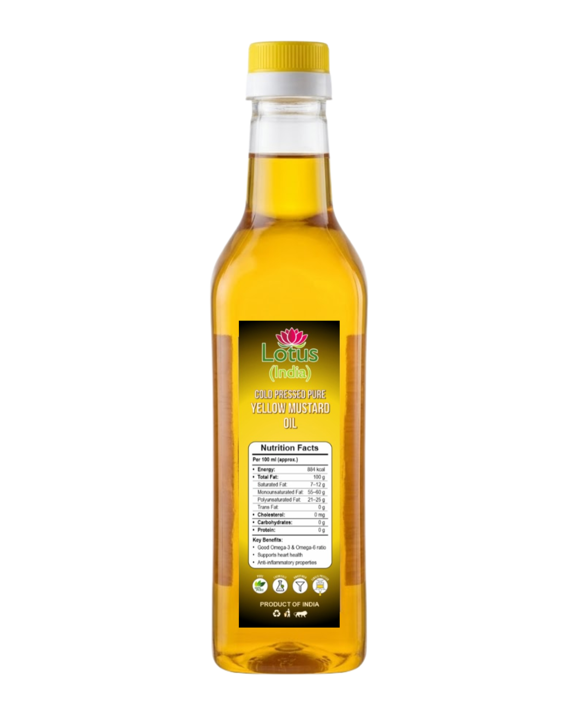 Bring home the authentic taste of tradition with Lotus (India) 100% Pure Cold Pressed Yellow Mustard Oil — extracted naturally to preserve aroma and nutrition.